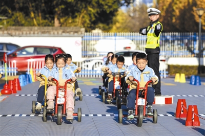 2025年12月1日,在安徽省黄山市屯溪示范幼儿园,孩子们在交警的引导下体验道路安全驾驶。