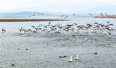 12月11日,在安徽省合肥市庐江县黄陂湖湿地东北水域,数十只白天鹅与大批青头潜鸭、反嘴鹬、野鸭等珍稀候鸟在湖中浅水、滩涂一起尽情嬉戏、觅食,在冬日里奏响生机勃勃、自然和谐的生态交响曲。近年来,庐江县加大力度对黄陂湖湿地实施生态环境保护,退渔还湖使得4万多亩的湿地生态环境得到较大改善。