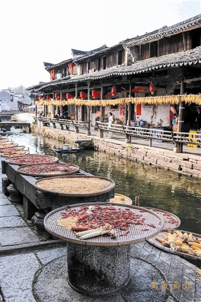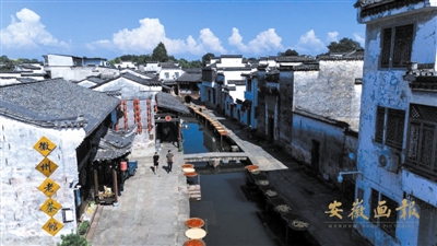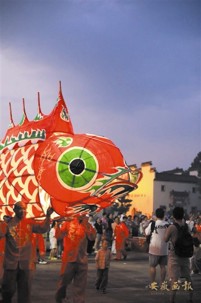 一条小溪穿流在村落,两旁是并肩而立的店铺和民宅。在一些重要节庆日的夜晚,徽州鱼灯穿梭在水街两旁,与河面倒影相映成趣。