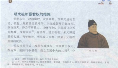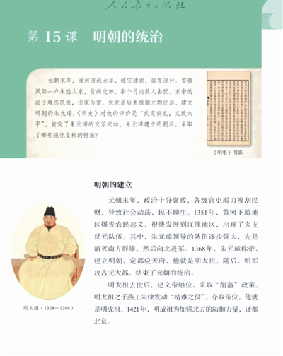 新教材选用的朱元璋画像圆脸方额、眉目清朗、神态威严,尽显开国君主的风范。澎湃新闻记者经过比对,这幅画像与国家博物馆曾经展出的《明太祖朱元璋正形像》 相似。据《光明日报》报道,2019年人民教育出版社出版的普通高中教科书《中外历史纲要(上)》中,朱元璋就已告别“鞋拔子脸”,在人教社官方网站上,2024年版的初中历史教科书(七下)中朱元璋也已被替换。