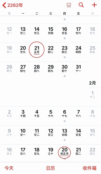 根据万年历查询,2262年1月21日是农历正月初一(第一个春节),2月20日是闰正月初一(第二个春节),这种闰正月现象十分罕见。