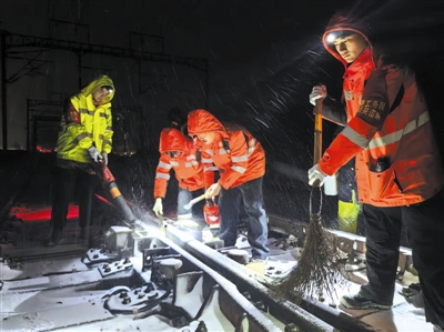 上铁集团在安徽淮北车务段迅速集结管内 26 支扫雪除冰突击队,面对极寒雨雪天气,240 余名干部职工携带640 余米防滑垫、1000余公斤工业盐、480 余公斤防冻液奔赴一线,及时清扫站台、道岔等关键部位积雪积冰,在人行过道铺上防滑垫,并通过广播宣传、摆放安全提示牌等方式,提醒旅客注意安全,防止滑倒摔伤。阜阳北站出动扫雪人员442人次,清扫站前通道、天桥以及站台上的积雪、积冰,在进站口、地道等处铺设防滑垫76卷,并安排工作人员在进出站口、地道、天桥等处做好引导。合肥南、庐江西、淮南南、寿县等车站增派工作人员做好车票退改签工作,增加候车室空调机组的巡检维护频次,加强热水供应,为旅客提供舒适候车环境。