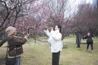 2月2日,市民在合肥市绿轴公园游玩赏梅。近期绿轴公园内梅花陆续绽放,吸引来许多市民前来拍照打卡。