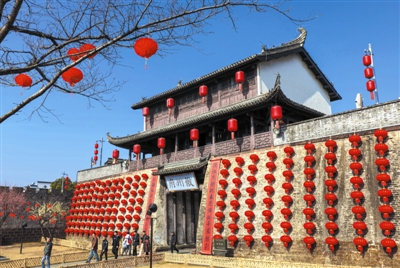 临近新春佳节,安徽省黄山市歙县的徽州古城张灯结彩,一串串大红灯笼与一副副徽州楹联点缀着古城墙,处处洋溢着喜庆的节日氛围,吸引众多市民与游客前来感受浓浓的徽州年味。