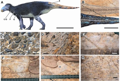 据介绍,与多数鸟臀目恐龙单一的鳞片覆盖不同,董氏豪龙体表具有三类不同结构的皮肤衍生物:尾部覆盖着多行重叠排列的菱形盾状鳞片,表面有放射状纹饰;颈部、胸部和臀部分布着圆形或多边形的瘤状基底鳞片,彼此镶嵌排列;基底鳞片间隙还散布着尖端朝后的皮肤刺,每平方厘米约3至5根。