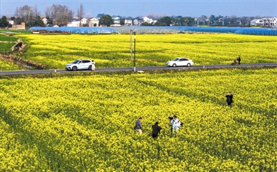3月10日,合肥市庐江县万山镇水关村陶庄村民组数百亩油菜花在春风里灿烂绽放,娇嫩唯美,与村舍、山岭、道路交相辉映,勾勒出一幅大美春日田园风光,诗意盎然,吸引了游客纷纷前来打卡,欣赏美景,留住春天的光影。