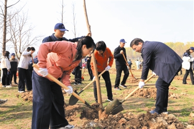启动仪式后,现场各单位代表、志愿者们、少先队员纷纷拿起铁锹、提起水桶,投入到热火朝天的植树劳动中。大家分工协作、配合默契,扶苗、培土、浇水,每一个环节都认真细致,现场气氛热烈而有序。
