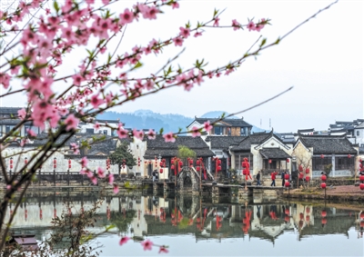 3月17日,春日的安徽省黄山市徽州区呈坎古村一派生机盎然,粉红的桃花点缀在粉墙黛瓦间,新绿的柳枝轻拂永兴湖畔,与古桥、民居构成一幅色彩斑斓的江南春景图,令人沉醉。