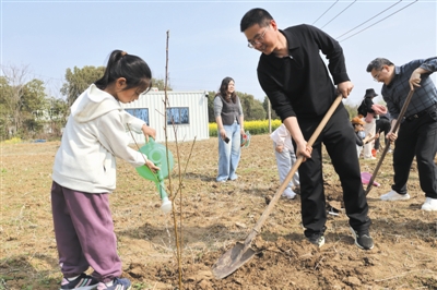 在种植基地,全体亲子家庭在认真聆听了专业人员讲解种植技术和要点后,便开始分组合作,栽种树苗。