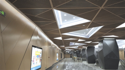 省文化和非遗馆站毗邻文化场馆,其设计深度融合地域人文意象,墙面通过几何构成重组传统纹样,天花则以层叠交错的手法模拟 “松针竹影”。配合无主灯照明系统,柔和的光线在站内洒下斑驳“光影”,既展现徽风皖韵的典雅底蕴,又体现现代公共空间的艺术格调。