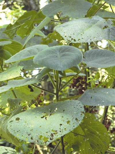 和想象中不同,金皮树并未靠这种特殊的“毒刺”横行霸道。事实上不少动物会吃它的叶子,把它咬得坑坑洼洼。
