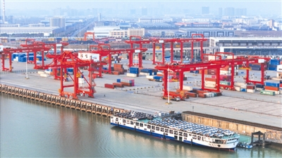 在合肥派河港,省港航集团港航物流集团有限公司党支部书记、总经理王干向记者介绍,合肥派河港是合肥区域主要集装箱港口之一,全域纳入中国(安徽)自由贸易试验区合肥片区,是合肥生产服务型国家物流枢纽重要组成部分。2025年1月,合肥-上海汽车滚装航线首航成功,开创合肥内河汽车滚装运输的历史。2025年完成集装箱吞吐量13.5万标箱,其中危险货物集装箱超3000标箱,汽车滚装1.5万辆,为“新三样”顺利出海提供了稳定可靠的水运通道。
