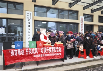 “两节废旧电池可以换一个鸡蛋,过期药品、废旧灯管都能拿来换!”今年3月5日学雷锋纪念日,新蒲社区活动现场排起长队。志愿者们搭建有害垃圾兑换点,发放宣传单页,讲解有害垃圾的危害和分类要点。居民们纷纷拿来家中的过期药品、废旧电池、废灯管,志愿者逐一清点登记,递上新鲜鸡蛋和环保袋。家住镇淮一期的李阿姨笑着说:“以前不知道废旧电池该扔哪儿,攒了一小袋,今天终于找到了归宿。”这场活动共收集有害垃圾40余件,发放宣传资料120份,兑换鸡蛋200枚。用“有害换有爱”的方式,垃圾分类正从“新时尚”变成“好习惯”。类似活动已成常态。2025年5月,“绿芽萌动 分类成风”第三届城市生活垃圾宣传周吸引50余名居民参与;同年4月,锦绣华府小区通过“面对面”讲解、卡片投放小游戏,让居民在实践中掌握分类技巧。目前,新区已累计开展入户宣传30余次,发放《生活垃圾分类指引》手册6400份,覆盖居民3000余户。