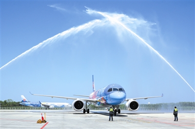 为庆祝国产大飞机首次在合肥机场执飞商业航班,合肥新桥国际机场特意举行了民航界最高礼遇的“水门仪式”(如图),迎接远道而来的国产大飞机。同时,机场方面特意为首航机组定制了主题蛋糕,传递对国产大飞机首航合肥的美好祝福。